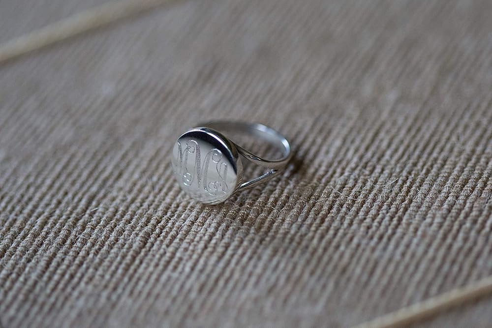 This ring is a customer favorite. It is made of 925 sterling silver. We will permanently engrave the monogram on the round disc. Our production time is 2-4 business days. Available in whole sizes 5-10.