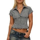 Women's Summer Plaid Print Shirt, Short Sleeve Turn Down Collar Button Down Slim Fit Blouse