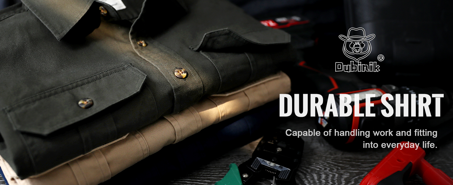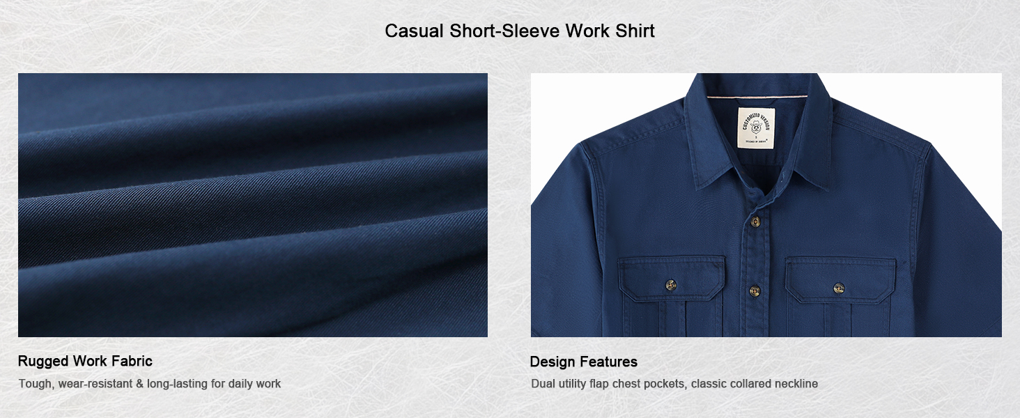 【Product Features】 This cotton short sleeve shirts for men is made of thick, crisp, well-shaped, and substantial fabric. The mens shirts casual not only combines fashion and functionality but also incorporates a workwear style and canvas texture, enhancing the overall appearance when worn. The solid color gives these short sleeve shirts for men a classic look, while the double chest pockets offer everyday convenience. A finely crafted placket with a brand label adds an iconic touch.