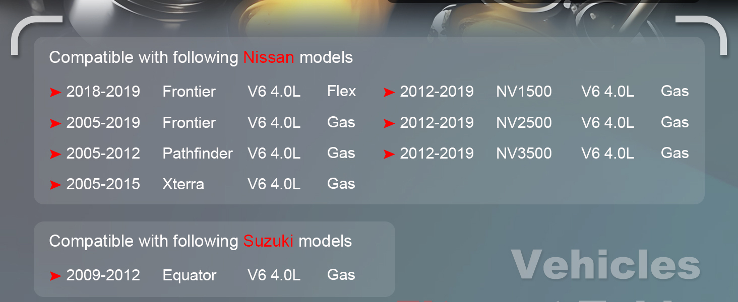 Vehicles Fitment-1: Compatible with Nissan Frontier V6 4.0L Flex 2018-2019, Frontier V6 4.0L Gas 2005-2019, NV1500 V6 4.0L Gas 2012-2019, NV2500 V6 4.0L Gas 2012-2019, NV3500 V6 4.0L Gas 2012-2019, Pathfinder V6 4.0L Gas 2005-2012, Xterra V6 4.0L Gas 2005-2015