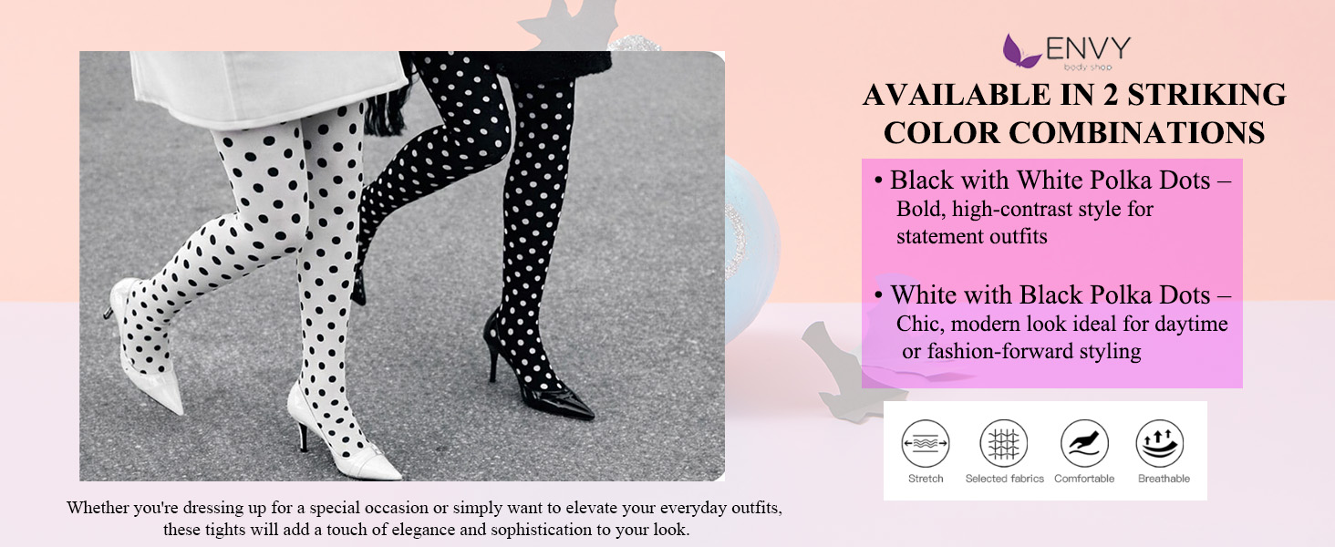 Step into timeless elegance with Envy Body Shop's Opaque Sheer Polka Dot Control Top Pantyhose. These stylish tights feature a playful polka dot pattern that stops at the thigh area, creating a sophisticated look that pairs perfectly with skirts and dresses. The opaque-sheer finish delivers a polished leg appearance while the comfortable control top provides gentle smoothing for a more balanced silhouette. Available in classic White/Black and Black/White options, these versatile tights stretch comfortably for all-day wear. The quality construction ensures these pantyhose maintain their shape whether paired with heels for special occasions or boots for everyday style. Each package includes one pair of these fashion-forward tights that combine vintage charm with modern comfort. Hand wash cold and line dry to maintain their premium look and feel through multiple wears.