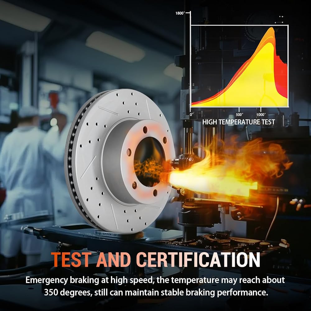 【Durability】Drilled and slotted brake rotors and ceramic brake pads are made of high hardness material, resistant to abrasion and high temperature, with a long service life, which reduces the frequency of replacement and maintenance costs