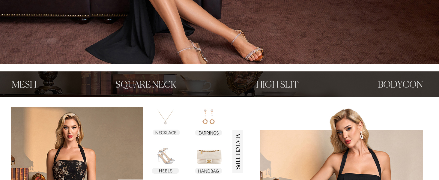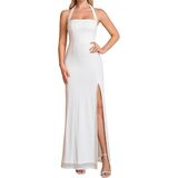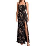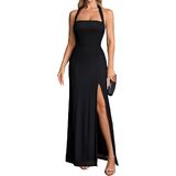 Feature:Features a halter square neckline with a fitted, bodycon-inspired bodice and a high front slit for sultry movement. The back is backless with a tie-back detail and a hidden side zipper for easy on-off and an adjustable, secure fit