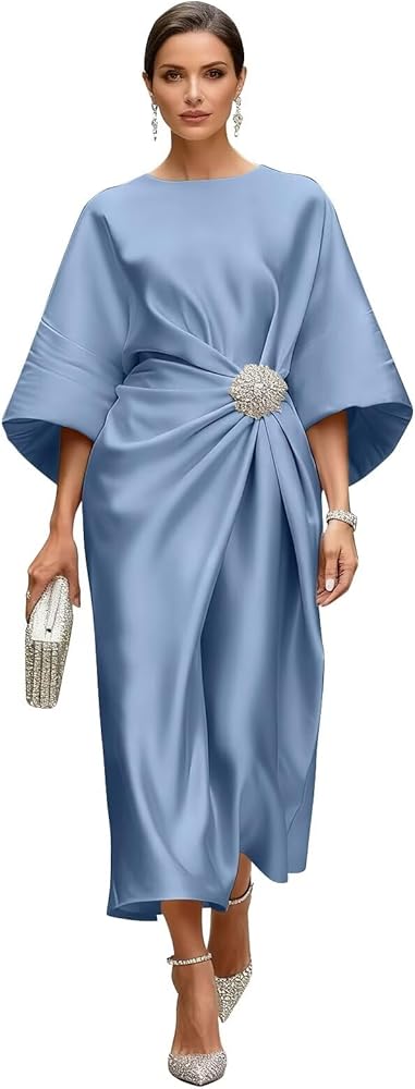 Feature:Satin Half Sleeves mother of the bride dresses for women, Tea Length Beaded mother of the groom dress,A Line Pleated Wedding Guest Dress,Elegant Formal Evening Gowns with Sleeves,ruched,round neck,Wide sleeves ,zipper back,