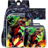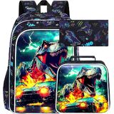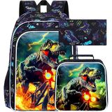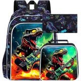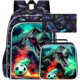 3 in 1 Boys Backpack: Dinosaur backpack: 16"x 12"x5", lunch box: 9.5 "x 8.5 "x 4", pencil bag: 8.66"x4.72"x0.5", there is no doubt that rich kids backpack set can carry more love for your school.
