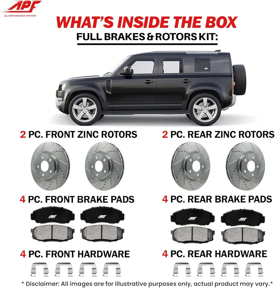 APF All Performance Friction Full Zinc Rotors and Ceramic Carbon Fiber Rear Brake Pads kits are carefully crafted to meet the original equipment manufacturers' (OEM) specifications. Besides the additional benefit of an easy bolt-on installation, this ensures that our rear rotors and brake pads provide optimal performance, maximum comfort, and a seamless aftermarket vehicle modification. Drive with precision. Drive with confidence. Drive with APF today!