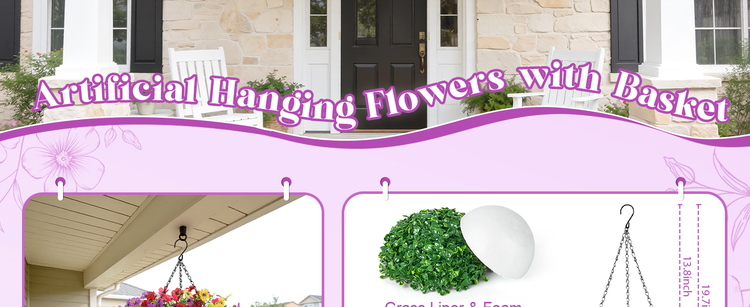 Easy Assembly: The fake hanging flowers can be DIY according to your needs; in just minutes, you can create beautiful fake hanging baskets; Tip: Add a few stones to the basket for extra stability, helping it stay secure even in strong winds