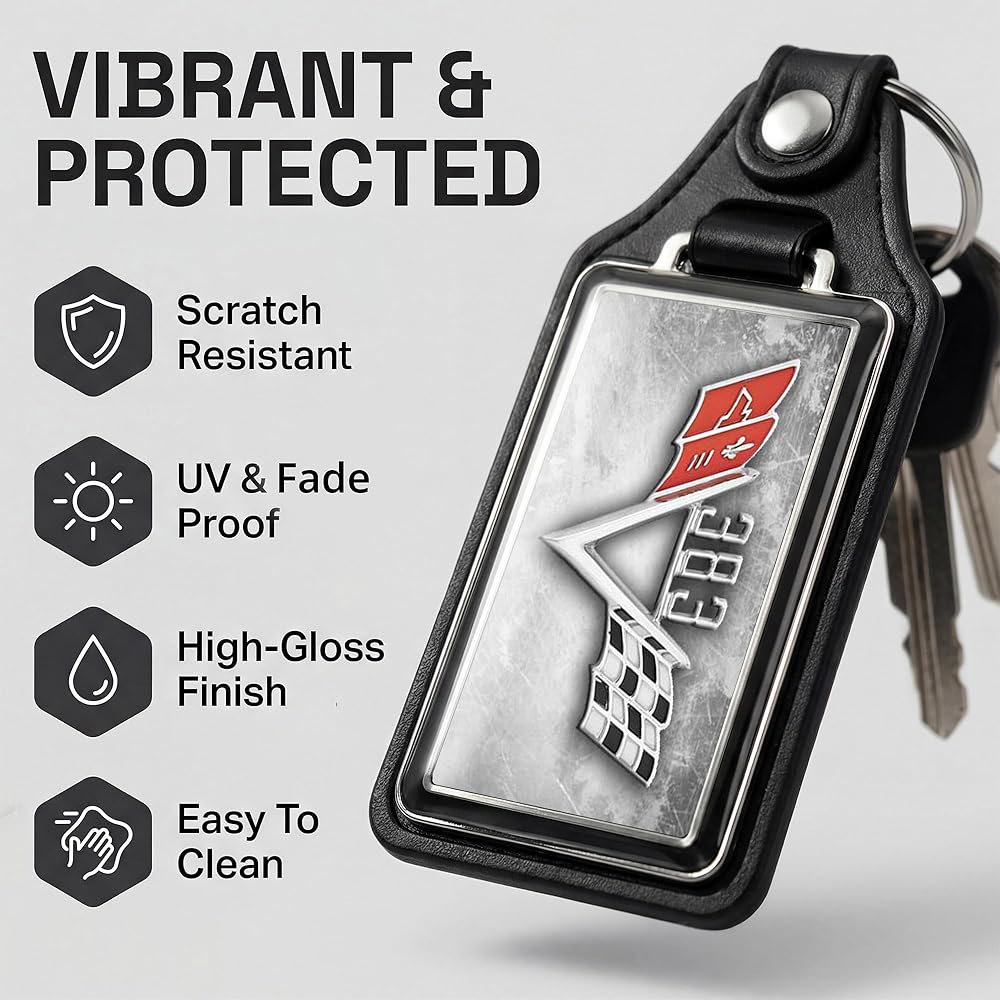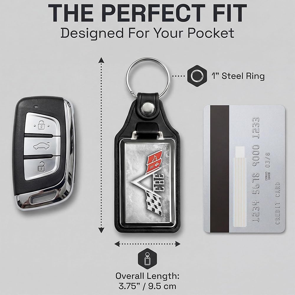 - Keychain holder is made of heavy duty leather like material with a chrome frame to make the graphic pop.