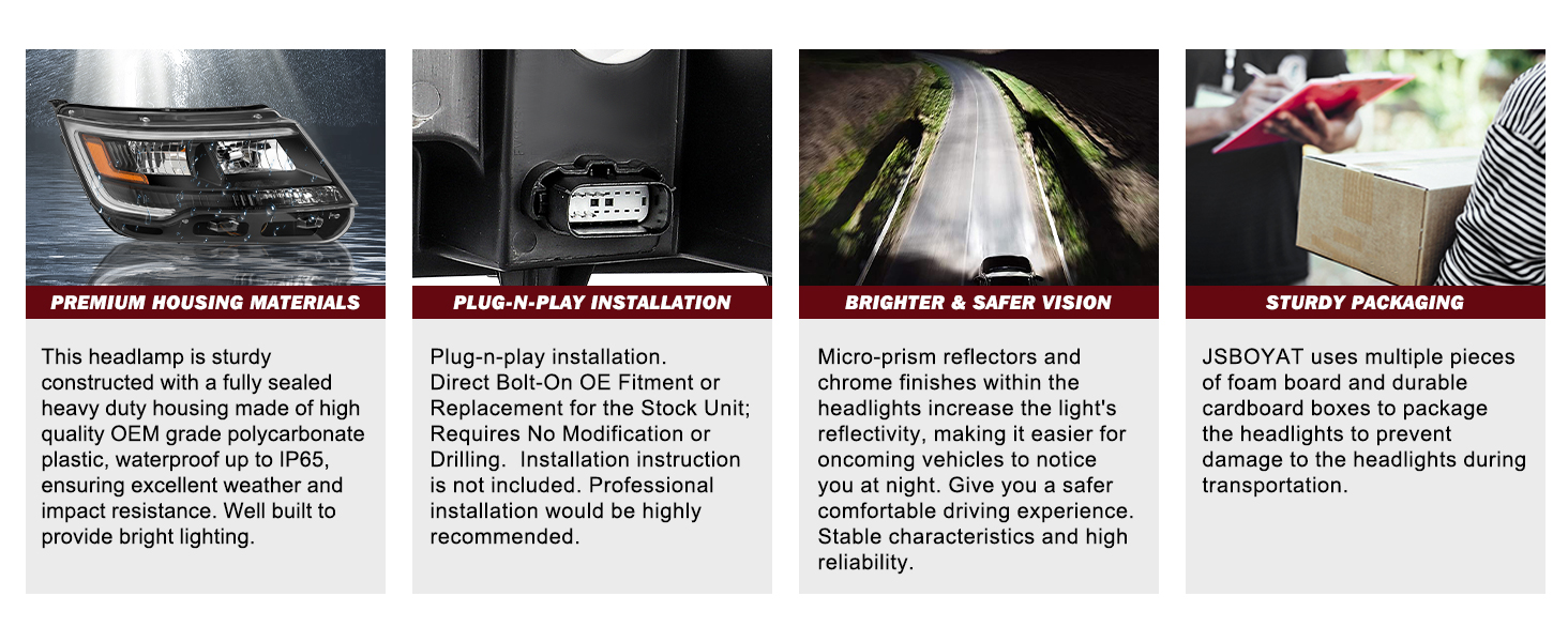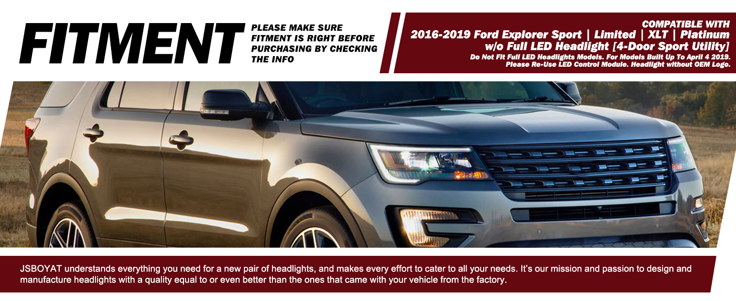 💡【VEHICLE COMPATIBILITY】Headlight assembly w/ DRL is compatible with 2016-2019 Ford Explorer Sport Limited XLT Platinum. ATTN: Do Not Fit Full LED Headlights Models. For Models Built Up To April 4 2019. Please Re-Use LED Control Module. Headlight without OEM Logo. Bulbs are not included. High beam bulb type: 9005; low beam bulb type: LED; signal light: 3757NAK; side marker light: LED. OEM Part Number: FB5Z13008V FB5Z13008H; Partslink Number: FO2518131 FO2519131.
