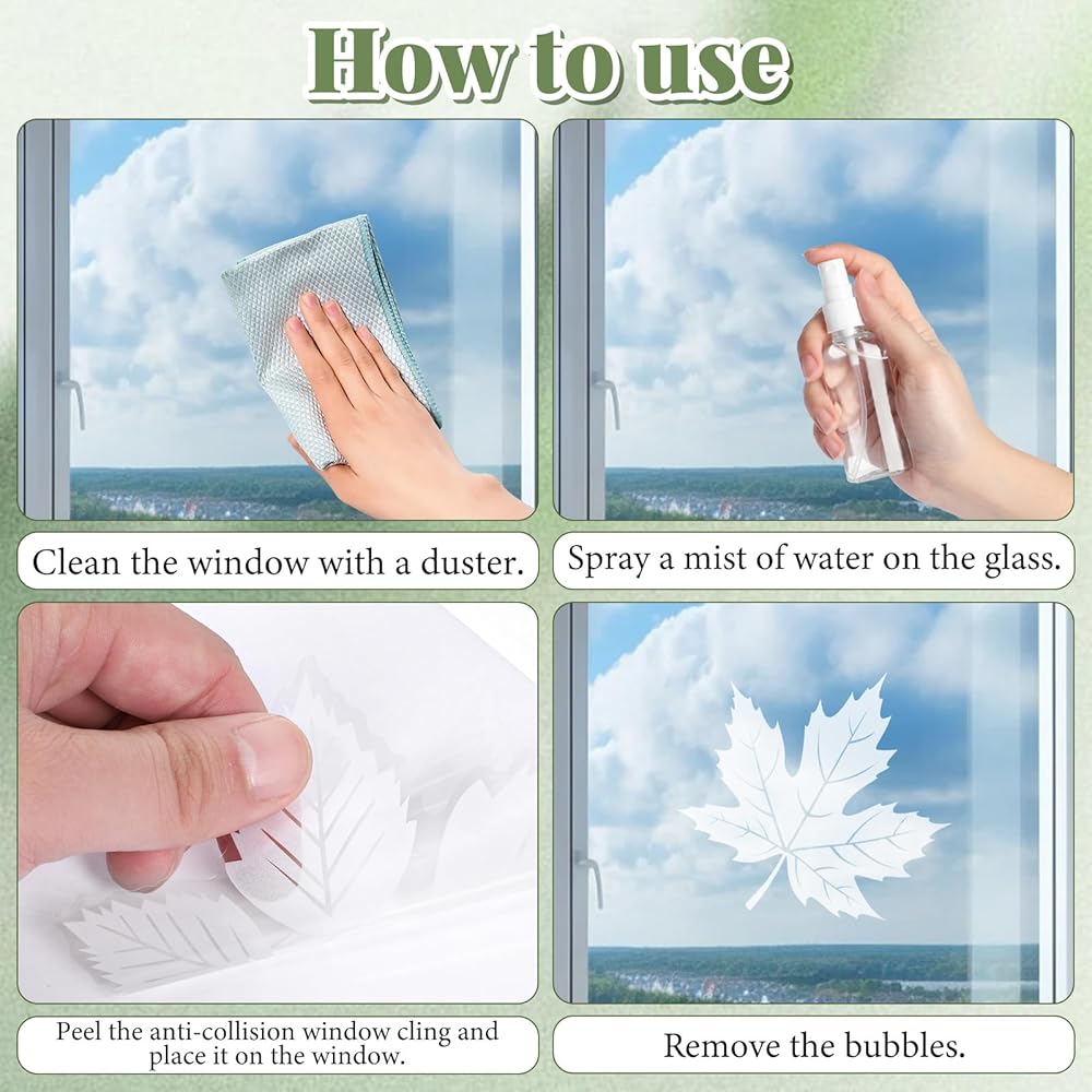 Easy to Use: Clean the window surface, spray the glass with water, then peel off the bird-proof sticker and apply it to the window, removing any bubbles.
