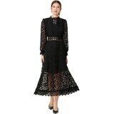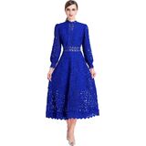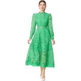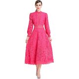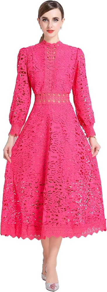 - Features: Round neck, loose puff sleeves, hidden zipper at back. Midi length, lined, pleated swing hem, solid color, slim fit .The cute crochet waist highlights your body curves.