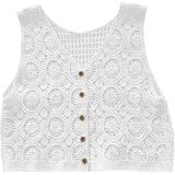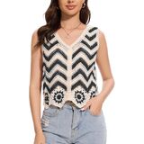 Breathable material, regular fit, soft to touch,sleeveless, solid color, lightweight, draped asymmetric hem, crochet mesh pattern, simple boho style.