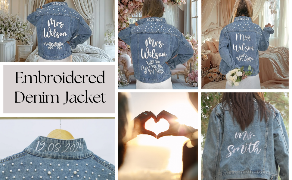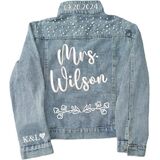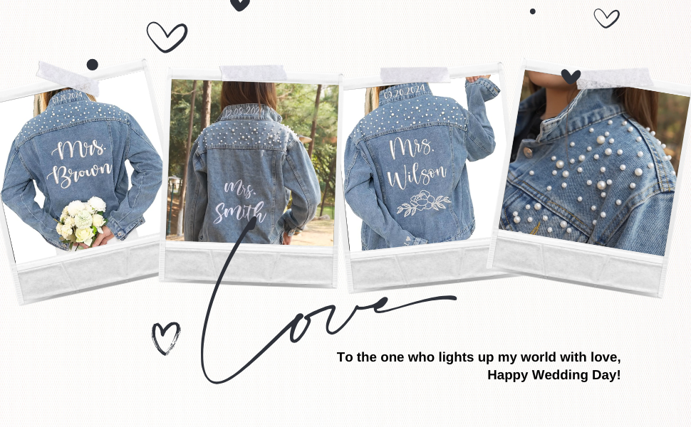 Personalize your wedding look with our custom denim jacket, featuring elegant pearls and your embroidered name or date. A unique and stylish keepsake for your special day.