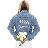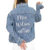 Make your wedding day even more special with a custom denim jacket adorned with pearls and embroidered with your chosen text.