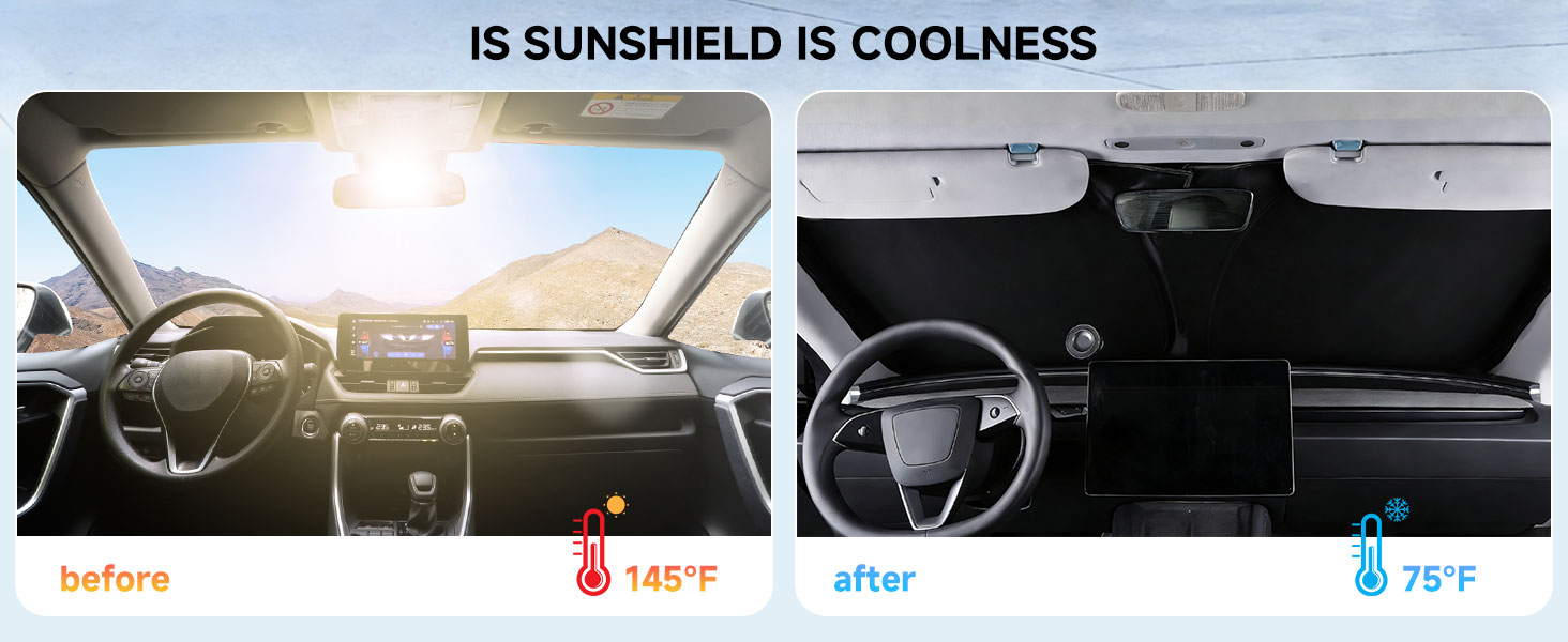 【Block Sunlight & Heat Absorption】windshield sunshade uses 240T composite material to block up to two-thirds of solar thermal load, significantly reducing over 99% harmful UV rays and lowering interior car temperatures up to 40°F ,offering enhanced insulation that keeps your car cooler even in the hottest temperatures, protecting your interior from heat-related damage