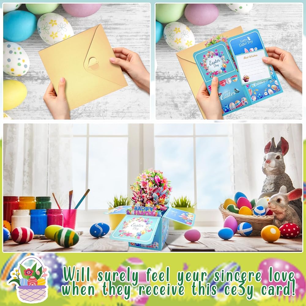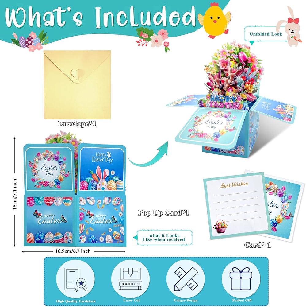 Easter Greeting Card with Envelopes: Made from high-quality, thick cardboard paper, this 3D Happy Easter Greeting Card with Envelopes is sturdy, not easy to bend or fade, and crafted for long-lasting keepsake value. The card measures approximately 3.4" x 3.4" x 7.3" and comes with a delicate matching envelope.