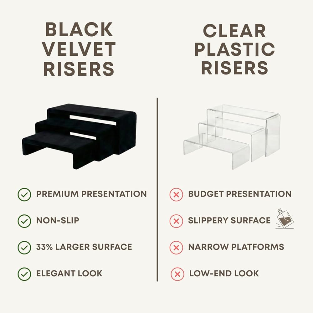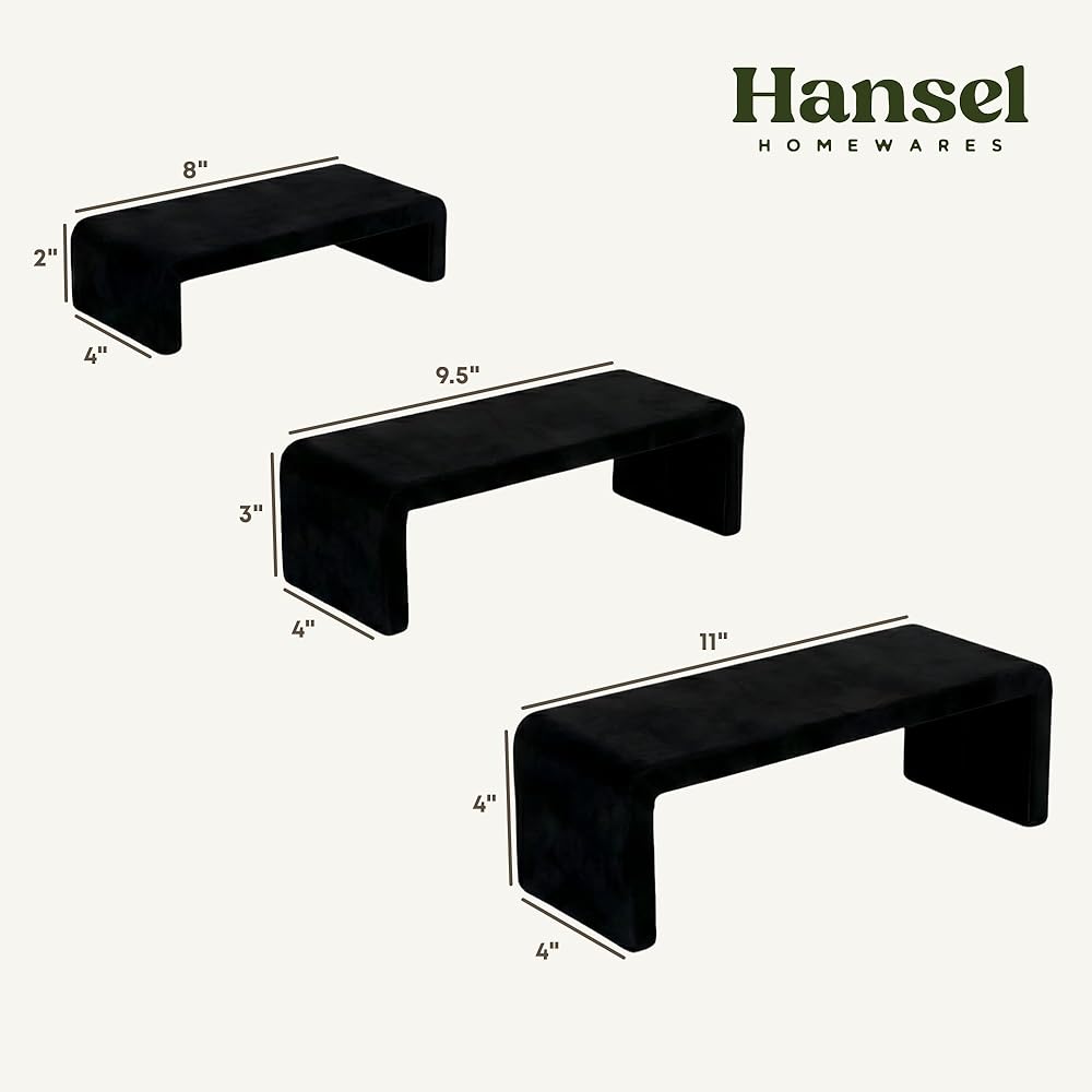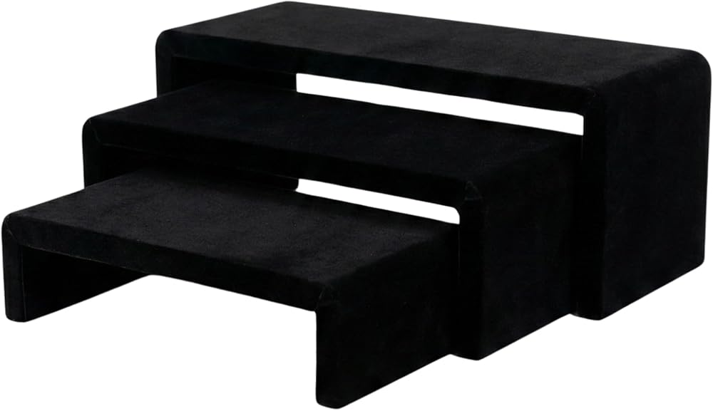Elevate your space with this set of three black velvet display risers — a sophisticated alternative to acrylic or plastic display stands. Whether you are building a cologne shelf for men, or styling a tiered display stand for collectibles, these risers bring instant elegance to any setup. The soft black velvet surface is non-slip and scratch-free, making it a premium choice for a cologne stand, perfume display or cologne organizer on the dresser. Use them as a purse stand in your closet, display stands for collectibles on a bookshelf, a vanity organizer for jewelry and watches, or display shelves for vendors at craft fairs, pop-ups and boutique events. All three black risers for display nest inside each other for compact nesting storage when not in use. The uniform 4-inch width across all three heights creates a clean, professional tiered display that works equally well as a dresser top organizer, cologne display, nightstand organizer or retail table riser fixture. The rich black velvet finish suits a wide range of interior styles — from minimalist and modern to maximalist decor, dark academia, whimsigoth and shelf decor aesthetic spaces. These black risers for decor are as much a style statement as they are a functional perfume stand or cologne storage solution. These black stands for display include three heights: large (11 x 4 x 4 in), medium (9.5 x 4 x 3 in) and small (8 x 4 x 2 in). A versatile aesthetic room decor piece and display shelf for vendors, fragrance collectors, handbag lovers and anyone who wants their space to look curated.