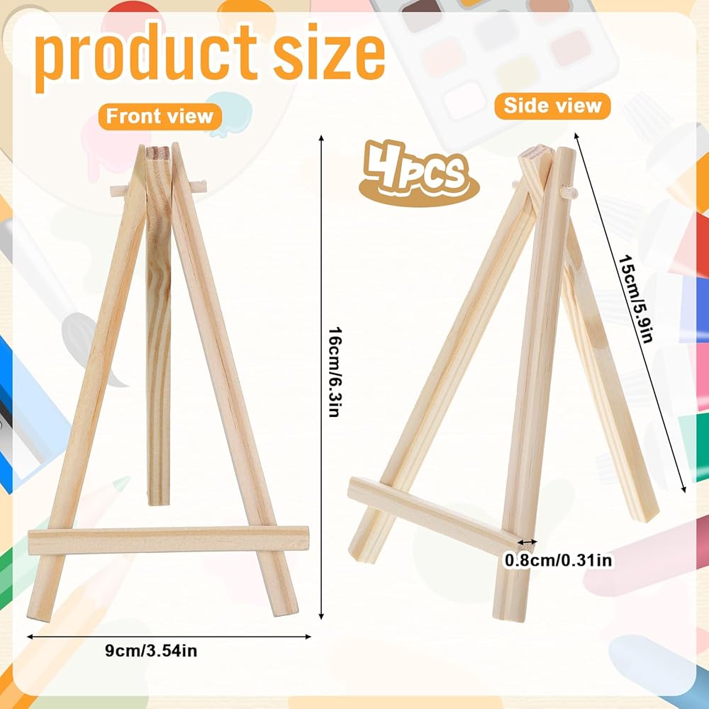 【Multi-functional Display】Each set includes four natural wood-colored easels, measuring 16x9 cm. These easels are ideal for displaying lightweight items such as cards, menus, and small artworks. Colors can be customized with paint to match your décor.