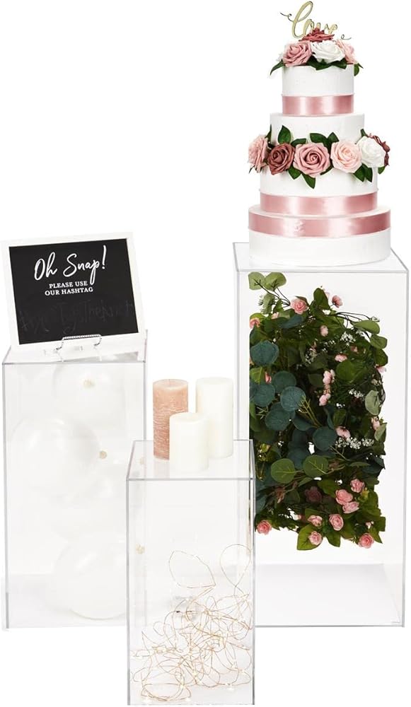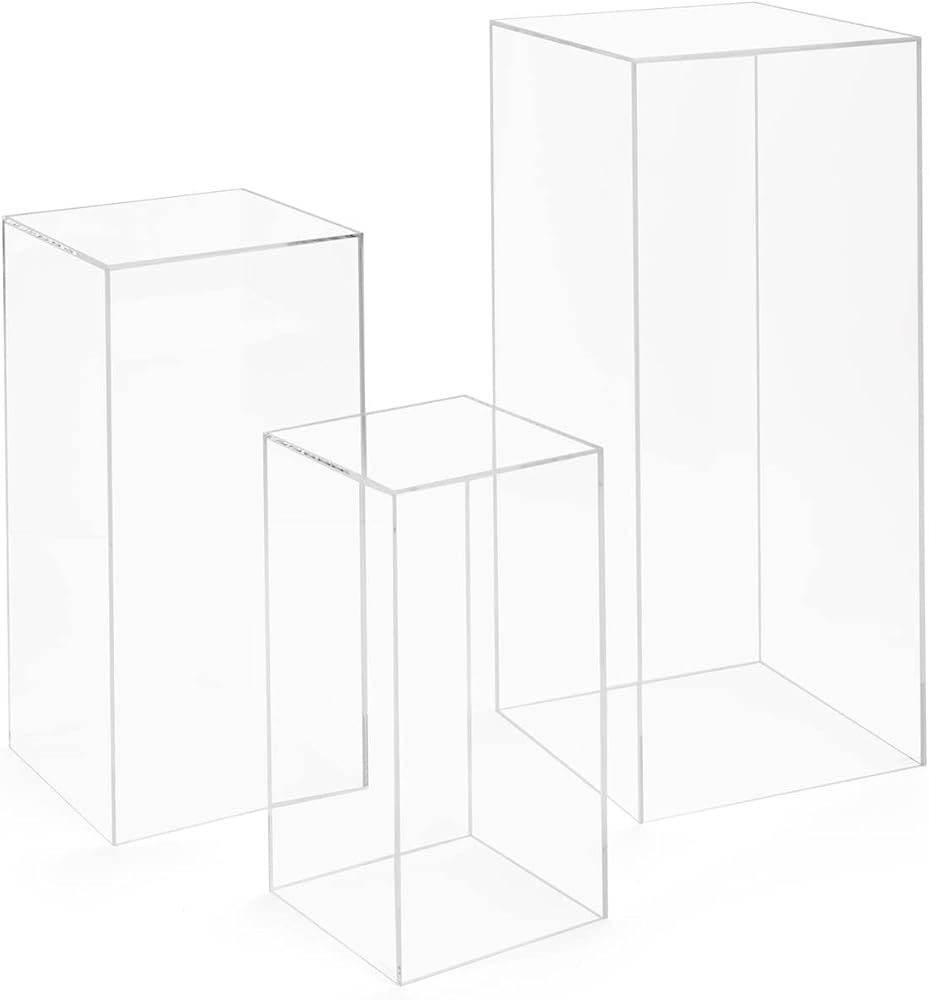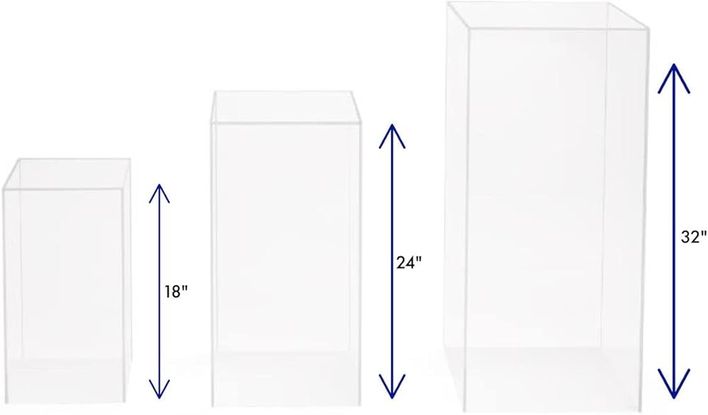 [ Elegant Display ] Our clear nested display pedestal set is an elegant and modern way to showcase items at weddings, boutiques, galleries, museums, and more.This riser collection features 18", 24", and 32" tall plinths, providing you with diversity for your retail or event exhibits.