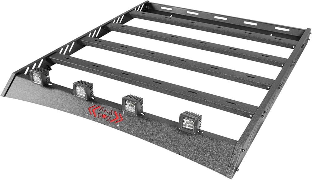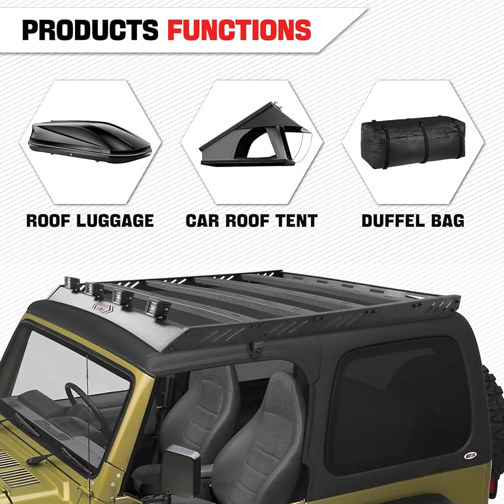 【Extra Load Capacity】Extra exterior cargo space, this rack has a dynamic load capacity of up to 220 lbs. and a static load capacity of up to 500 lbs. and can easily carry all off-road gear: extra luggage, camping equipment, tents, bikes, etc 【Multi-functional Crossbar Channels】The crossbar T-slot channels provide multiple solutions for securely fastening cargo while easily adding accessories such as lights, high lift jacks, shower systems, towing recovery plates, fuel containers, and spare tires to meet your needs 【Aerodynamic Design】The roof rack is designed with aerodynamic and streamlined front end to reduce wind resistance and noise. Enhance the overall appearance and make your TJ model unique and attention-grabbing