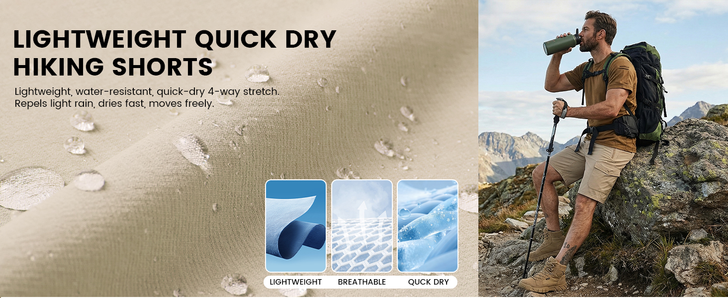 Lightweight & Quick Dry: Men's hiking shorts are made of breathable and 4-way stretch fabric— soft, tear-resistant, featuring moisture wicking and quick drying, keeping you cool at all times even during summer outdoor activities