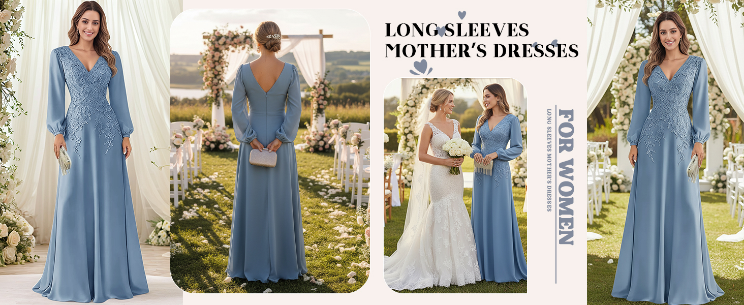 FEATURES: This Formal Mother's Dress is very Elegant, A-Line, Floor-Length, Long Sleeves, Deep V-Neck, Zipper Back Closure, Appliques, Ruffles Hemline.