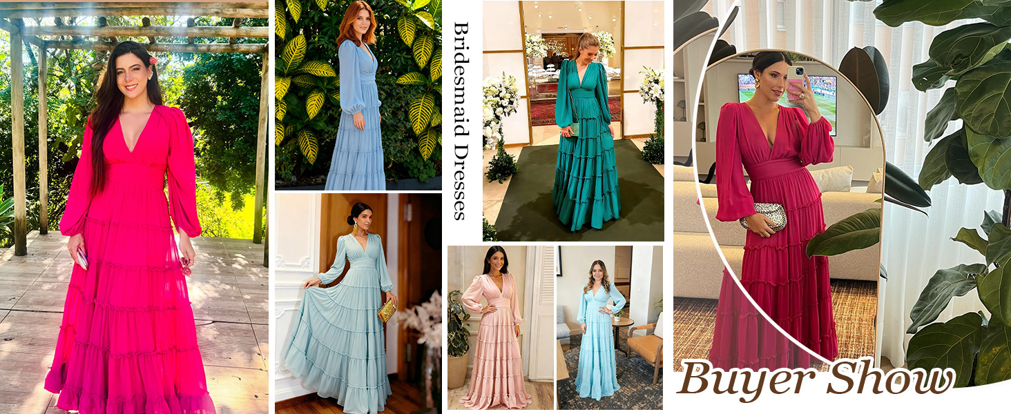 • Features: This long bridesmaid dress has long puff sleeves, ruffles, pleats, v neck, empire waist, fully lined, built-in-bra, zipper back, tiered, a line