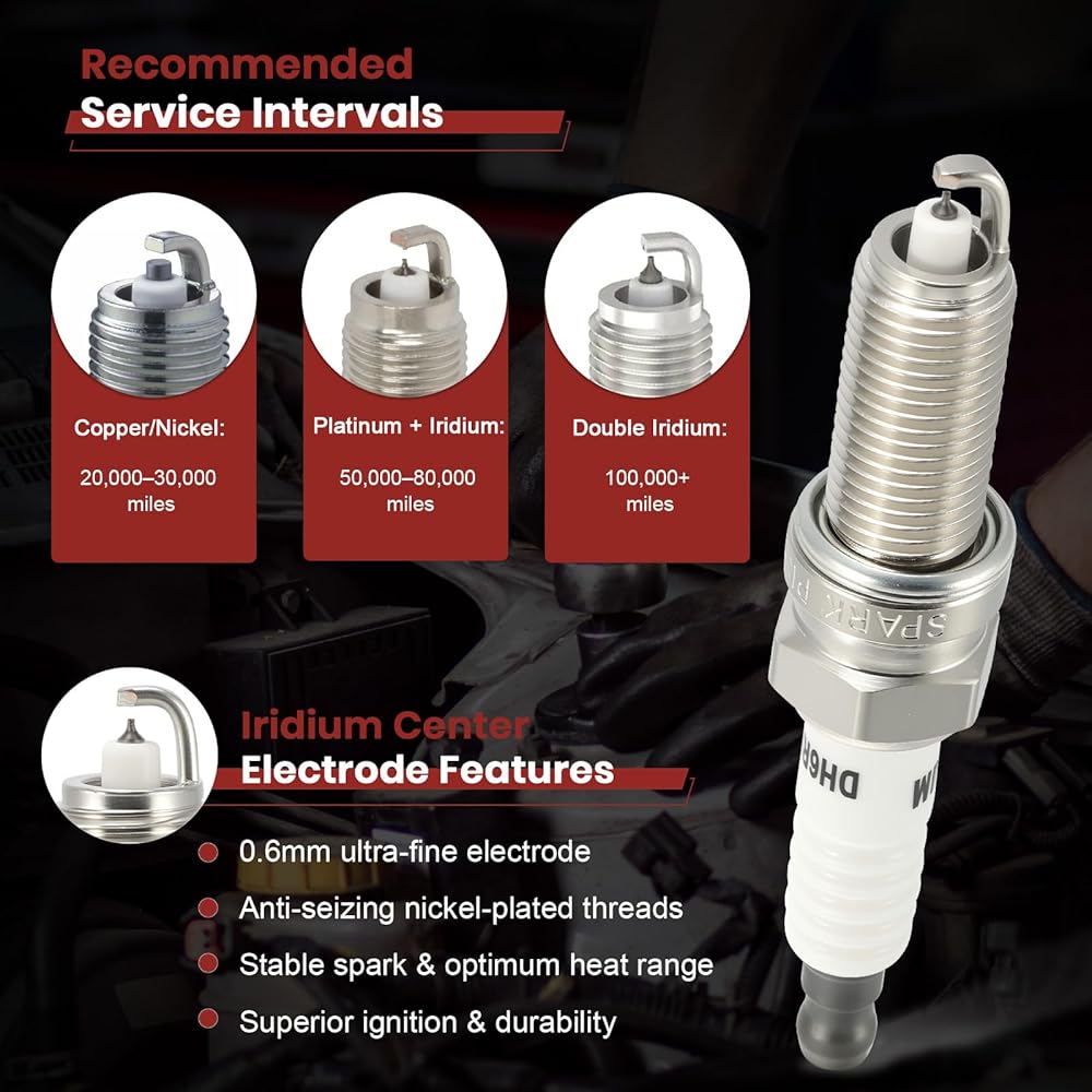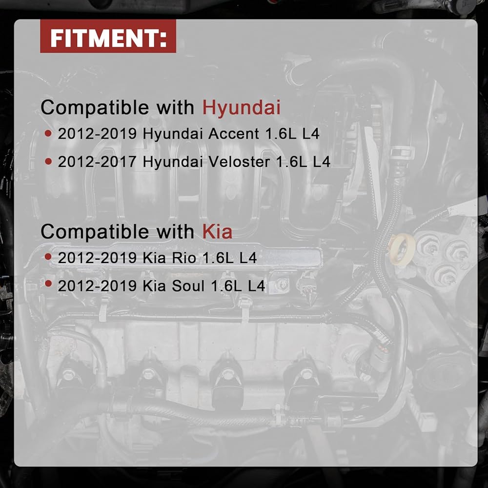Vehicle Fitment-1:Spark plugs compatible with Hyundai 2012-2019 Hyundai Accent 1.6L L4, 2012-2017 Hyundai Veloster 1.6L L4; compatible with Kia 2012-2019 Kia Rio 1.6L L4, 2012-2019 Kia Soul 1.6L L4