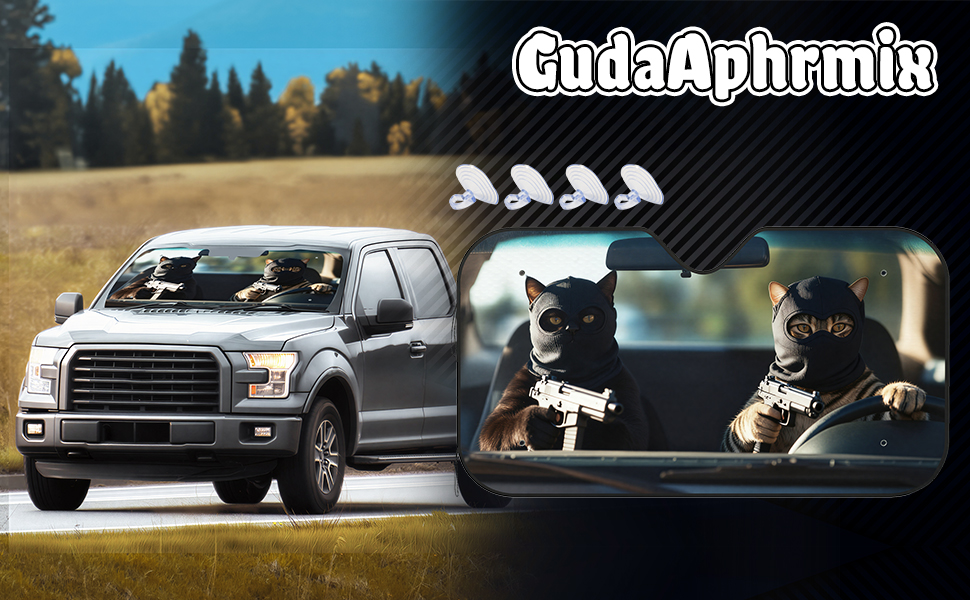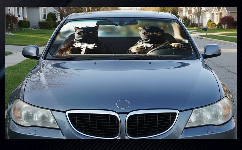 Material: Crafted from our uniquely engineered material, this funny prank cat masked Windshield Sunshade features premium double-sided aluminum foil. It effectively blocks and reflects sunlight while its thermal barrier design keeps your car cool, preventing heat damage.