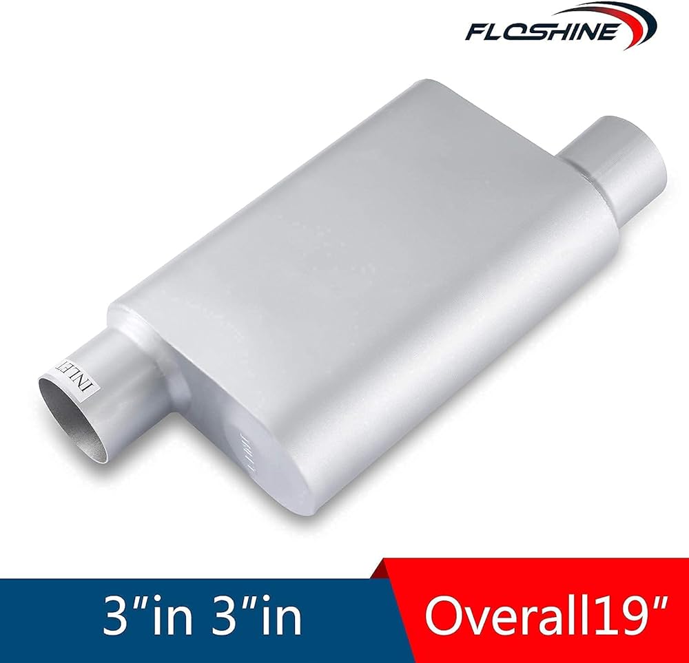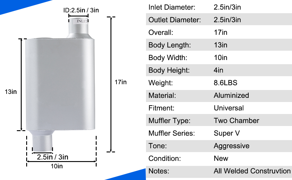 Performance Muffler size--3" offset in (ID) 3" offset out (ID) | Body Length: 13"| Overall Length: 17"| Body Height: 4" | Body Width: 10"