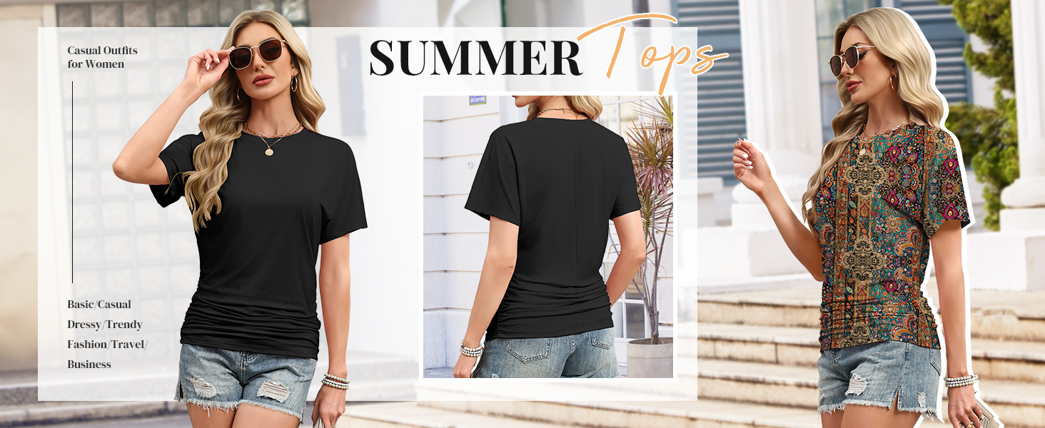 Summer Shirts Feature - The summer shirts for women features bat sleeve, ruched tops, solid color, crewneck, dolman short sleeve, cute summer tops, sides elastic shirring, loose fit, giving you a charming and trendy looking when you wear it