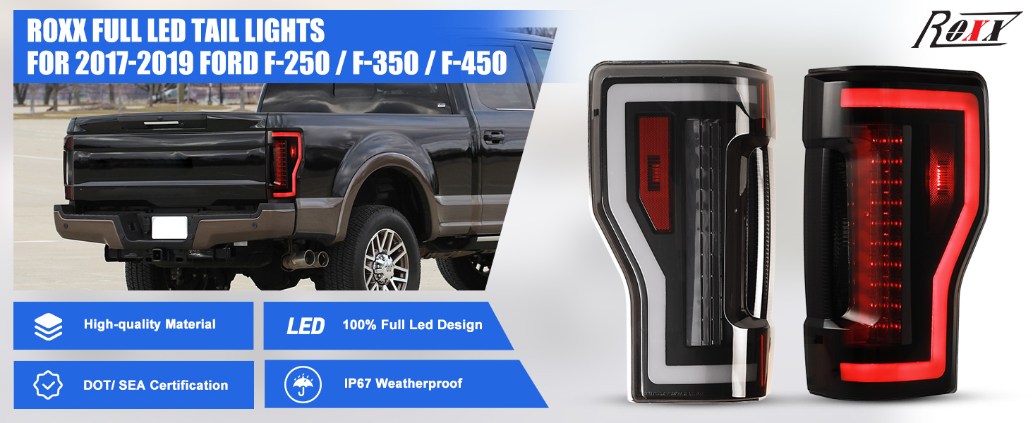 🚙【IP67 Weatherproof】The led 2017 2018 2019 ford super duty tail lights assembly made from superior OEM grade ABS plastic housing and full sealed beam, that can reach up to IP67 weatherproof to ensure pretty durability in heavy rain or terrible weather. Moreover, the well-designed breather has a good heat dissipation to make the lights breathable and extend the light's life.