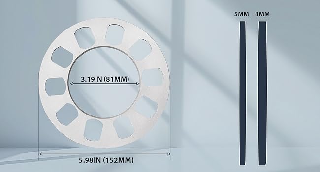【PRODUCT SPECIFICATION】Package Quantity: Pack of 4, each wheel spacer is 5mm (1/4") thick, has an OD (outer diameter) of 152mm (5.98") and an ID (inner diameter) of 81mm (3.19"), and fits most 5 lugs wheels/rims with a PCD (the span on bolts) range of 100mm to 120mm. NOT ADAPTER, only widen the wheels, do not change bolt pattern