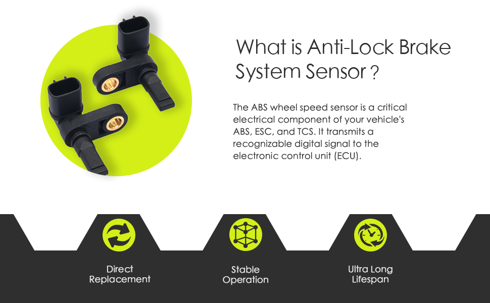 [About This Product:] The ABS wheel speed sensor is a critical electrical component of your vehicle's ABS, ESC, and TCS. It transmits a recognizable digital signal to the electronic control unit (ECU). It's generally recommended to replace both coaxial sensors together to ensure consistent signals from both sides.
