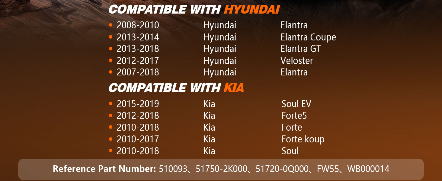 Compatibility Vehicle: Fit for 2008–2010 Hyundai Elantra, 2013-2014 Hyundai Elantra Coupe, 2013-2018 Hyundai Elantra GT, 2012-2017 Hyundai Veloster, 2007-2018 Hyundai Elantra, 2015-2019 Kia Soul EV, 2012-2018 Kia Forte5, 2010-2018 Kia Forte, 2010-2017 Kia Forte koup, 2010-2018 Kia Soul