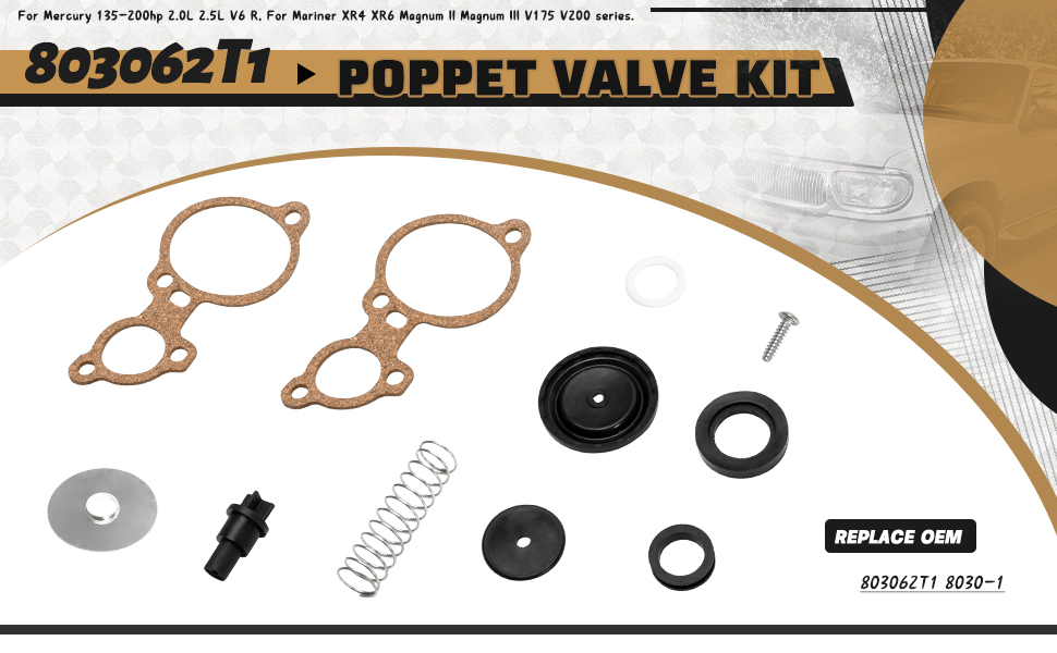 Function: Replacement parts for repairing/rebuilding the poppet valve for Mercury outboard engine, making maintenance easier and more convenient