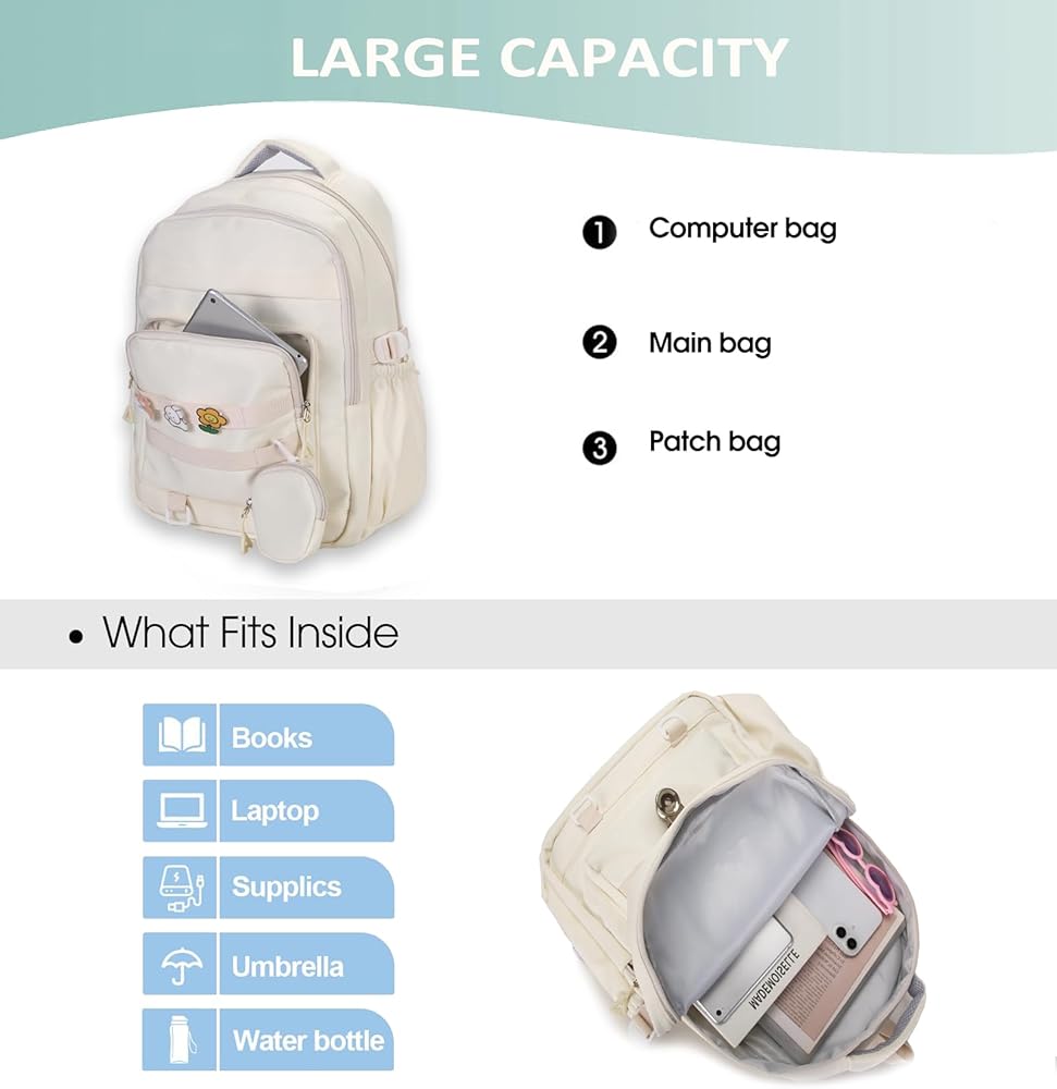 Aesthetic Backpack Size –Our cute backpack for women girls teens boys is 12.1*6.6*17.5 inch. This college school backpack for women teens girls include 1 main pocket, 2 zipper front pockets, 3 inner pockets. It's lightweight and roomy enough for your laptop, books or other small essentials. That's an excellent choice for travel, camping,hiking,school, or daily use.