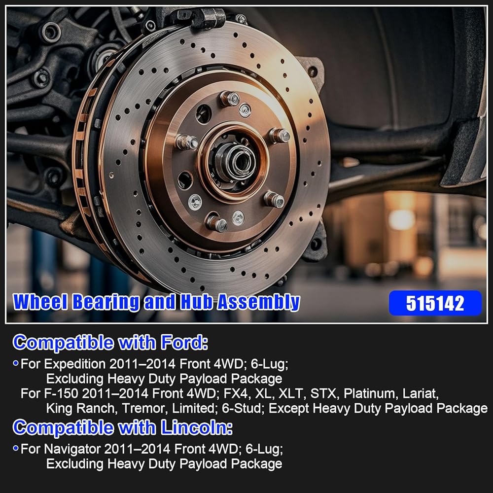 Compatible Vehicles: 515142 wheel bearing compatible with 2011-2014 Ford Expedition (Front; 4WD; 6-Lug), for 2011-2014 Ford F-150 (Front; 4WD; FX4, XL, XLT, STX, Platinum, Lariat, King Ranch, Tremor, Limited; 6 Stud), for 2011-2014 Lincoln Navigator