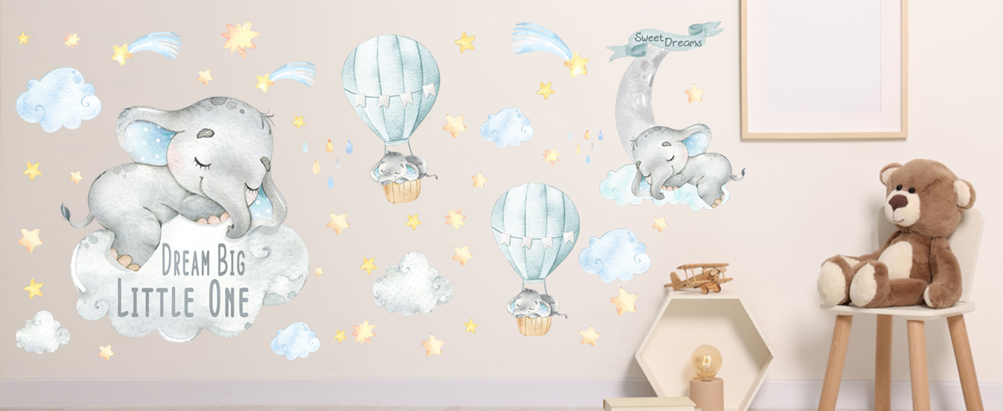 Yovkky Blue Watercolor Boy Elephant Wall Decals, Sweet Dream Big Little One Sticker Moon Hot Air Balloon Star Nursery Decor, Home Baby Shower Room Decoration Kid Toddler Crib Bedroom Playroom Art Gift