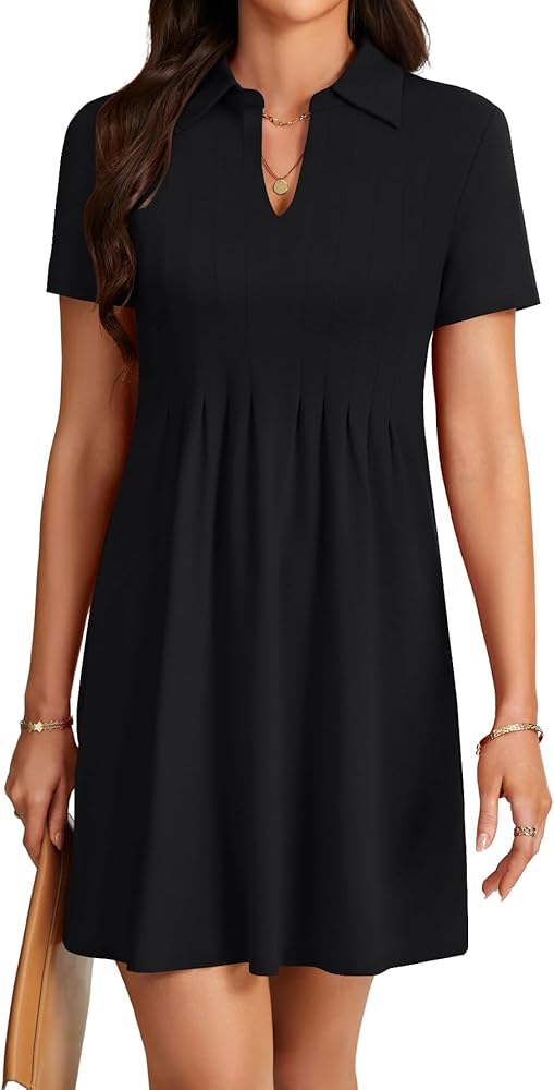 Features:This casual mini dress boasts a collared V neck that strikes a neat, chic vibe, plus delicate chest pleats that bring subtle textural detail. It comes with short sleeves great for warm weather, and its A-line silhouette paired with a loose fit ensures comfortable movement while flattering various body types. Made from soft, stretchy fabric, it keeps you cozy all day long.