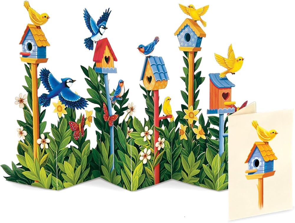 • BIRDHOUSE GARDEN SCENE of pop-up colorful birdhouses, flowers, and patterned birds and butterflies unfold in your hand. Comes with blank note card that is the perfect gift card holder for birthdays, Mother's Day, Valentine's Day, or just because.