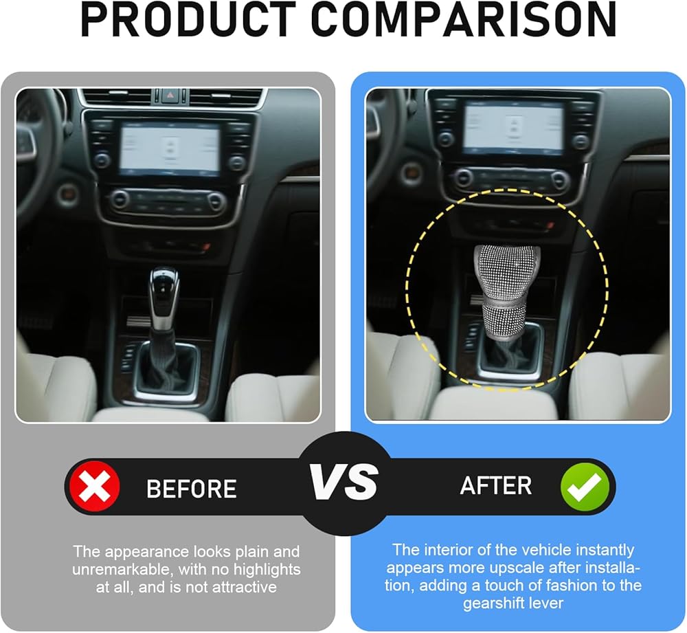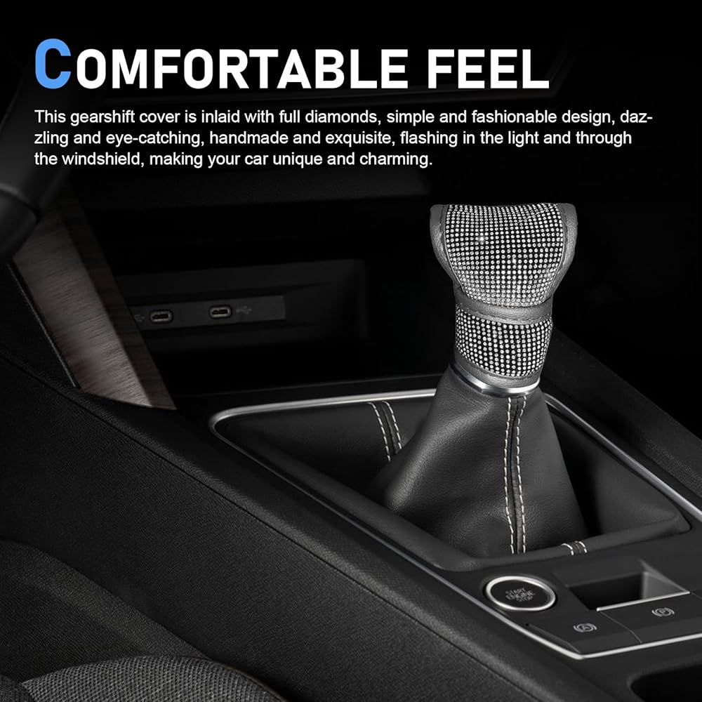 Premium Material: Gear shift knob cover is made with high-quality rhinestones and durable base material, smooth to the touch and safe for hands. Rhinestones are securely set to avoid falling off, ensuring a sturdy, comfortable feel during gear shifts, with lasting shine.