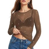 Material: Crafted from high-quality sheer mesh fabric, this long sleeve top offers a comfortable, lightweight feel with a delicate see-through design. The fabric is soft against the skin and features intricate glitter sparkly rhinestone , creating a dazzling, eye-catching look that's both elegant and edgy.