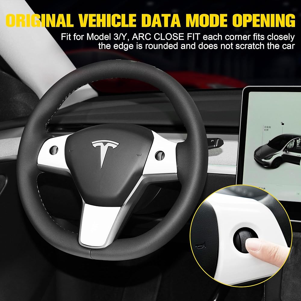 Perfect Fit: Custom-made for Tesla Model 3 and Model Y, this 3-piece steering wheel trim cover and 2-piece gear shift cover set ensures a seamless fit. Easy to install with peel-and-stick double-sided tape and an embedded design for the gear shift, no tools required.