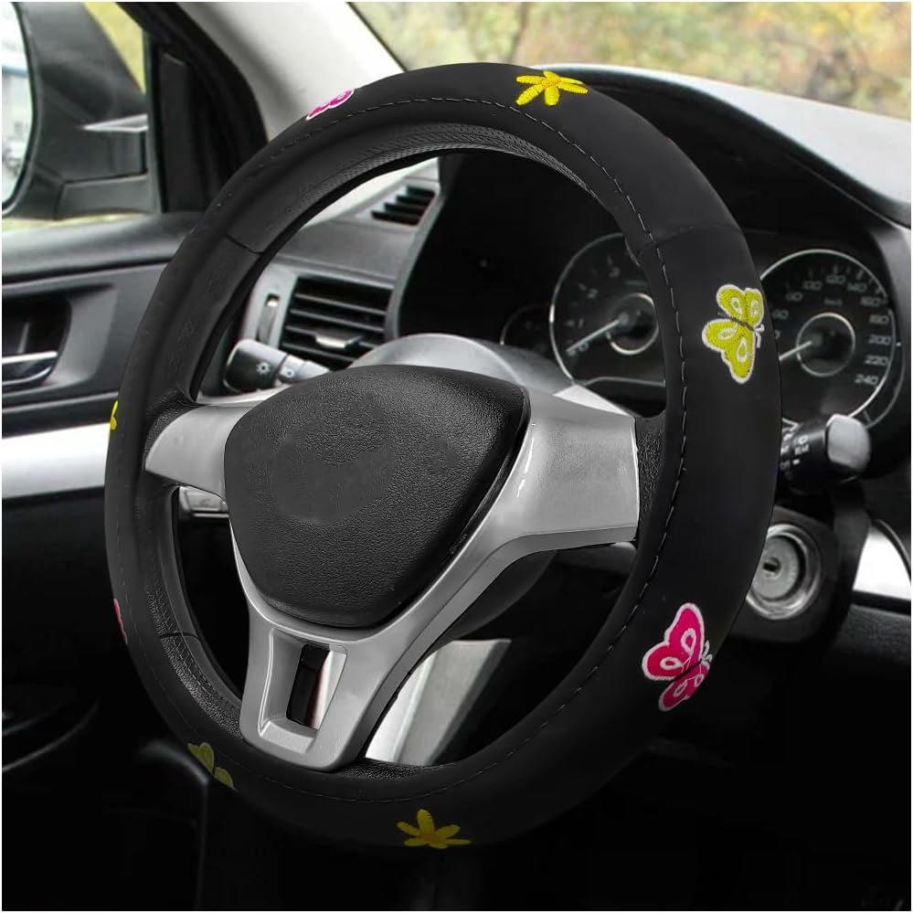 Butterfly Steering Wheel Cover, 15 Inch Anti-Slip Breathable Cute Steering Wheel Protector, Embroidery Butterflies Flower Auto Wheel Wrap for Women Girls, Car Accessories (Butterfly)