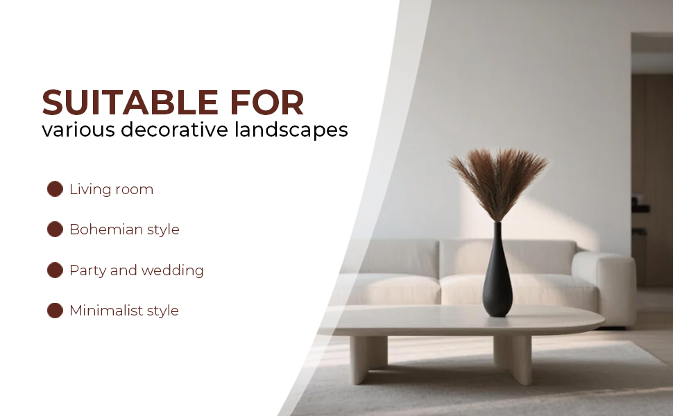 Various Decoration Sceneries:The faux pampas grass is suitable for living room,bedroom, hallway, dinning table. Apart from home decor, it is perfect for boho chic party and wedding decoration.The heads of each stem is designed you can fluff them up for a fuller look, create a chic minimalist, or Bohe modern display to complement your existing home arrangement