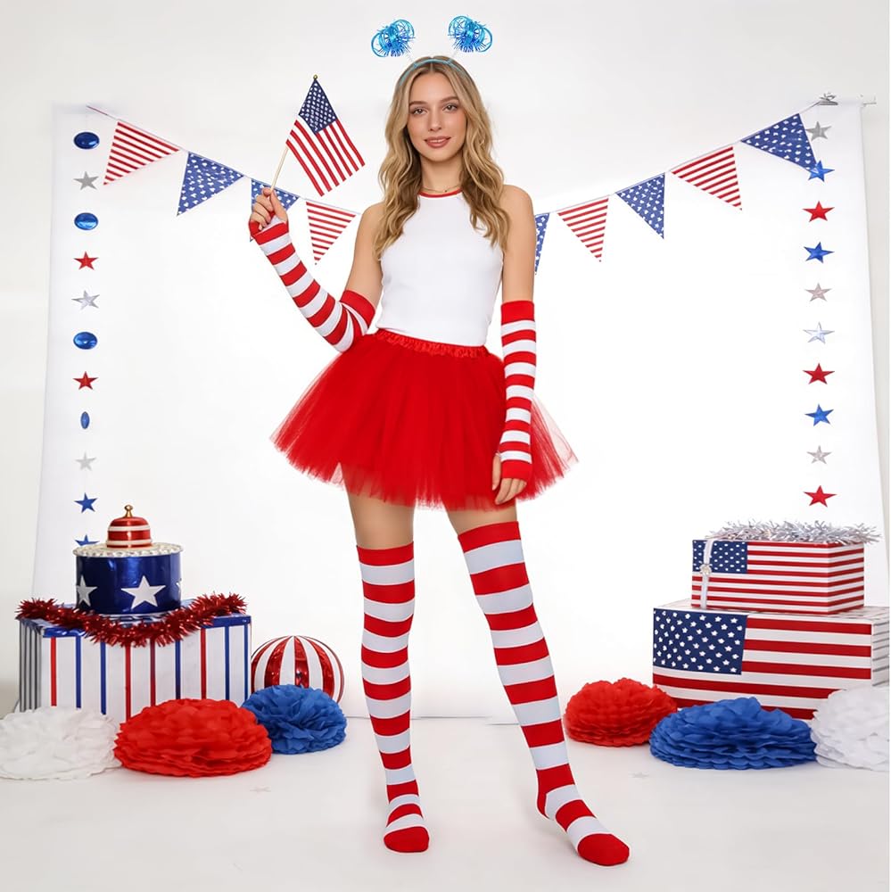 Get this costume sets to elevate your Halloween or party ensemble! This complete costume kit takes the hassle out of matching, featuring a blue ponytail headband, a tulle skirt, striped fingerless gloves and knee-high socks.