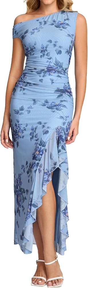 Off the shoulder dresses for women, bodycon maxi dress, ruched dress, long dresses for women featuring a stylish one-shoulder design that flatters the neckline and collarbone, uffled side slit adds playful movement and an eye-catching detail to the dress. It allows for ease of movement while showcasing a hint of skin, making it a great choice for those warm summer evening