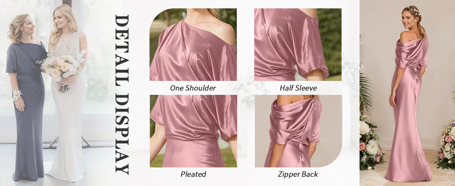 • This Half Sleeve dress features one shoulder, off the shoulder, 1/2 sleeve, with high/side slit, satin, pleated/ruched, mermaid, empire waist, floor length, fully lined, built-in bra, zipper back and soft lining