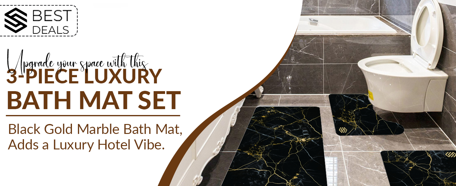 Marble Bathroom Rugs, 3PCS Modern Bath Mat Set, Black Gold Marble, Non-Slip Super Absorbent Bathroom Mat with Toilet Rug for Shower & Bathtub, Xmas & New Year Gift Ready